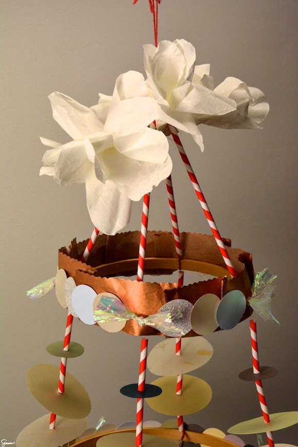 Begin by creating equal lengths of string or ribbon. Thread your circles and straws and then tie these strings to your circle hoop. Balance is key. I actually had to start over a few times before getting it right, so perhaps little alligator clips might be helpful as you get your tie points established. Then start building. Let creativity take over. In the case of pajaki I truly feel that more is more. There's no room for understated here. I used a glue gun to add little sparkling bows, that I cut from metallic twist. Add on as you see fit. I created a 2 tier one but certainly these could get longer if your heart desires.