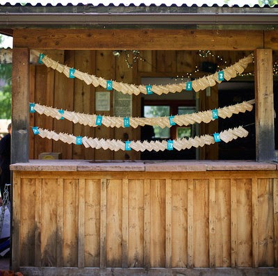 A garland of escort cards in Kraft brown emphasizes a beachy bashy do(above), while guests below are encouraged to "feast and frolic." Can do!