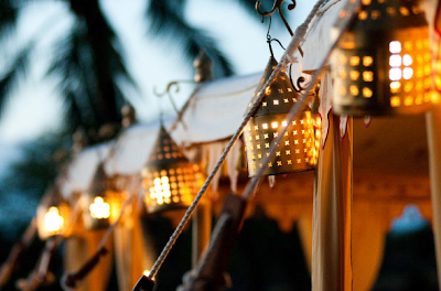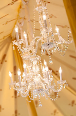 - Decorate the ceiling- drape yards and yards of fabric from the center out. Hang a grouping of vintage chandeliers from the center- inquire with local antiques shops if they can be rented. Hang lanterns, lantern string lights, string lights with more eclectic shapes- nests, aluminum shades, glass spheres.