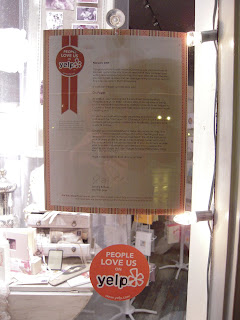 We recently received a letter via snail mail  :)  from Yelp.com commending us on our recent fabulous reviews. So we took full advantage and popped the oh so bold decal and letter it in our window.
