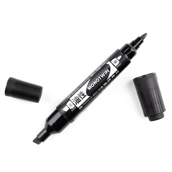 Permanent black marker with two durable tips – wide chisel tip and fine bullet tip. Works on a wide range of materials, including paper, metal, plastic, glass, vinyl, porcelain, leather, and wood. Two tips provide options for making thin or thick marks of smear-proof oil-based permanent ink. Durable tips made of polyester fiber (chisel tip) and acrylic fiber (fine tip) stay fresh and firm even after heavy use. Great for marking on shipping labels, boxes, pallets, signs, and more. Anti-roll chisel tip cap prevents marker from rolling off work surface. Water resistant black ink. 6mm chisel tip; 2mm fine tip. Also available in blue and red ink. Made in Japan