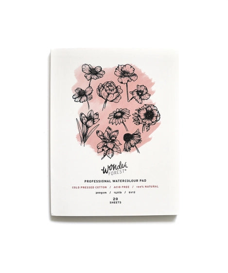 Our Professional Watercolour Pad comes with 20 sheets of thick 140lb (300gsm) cold pressed 100% cotton pulp based paper in a traditional 9×12 inch size. It’s a natural handmade style acid-free paper with a lovely texture, all combined in a fold-over cover pad with gum along the top for secure but easy sheet removal.