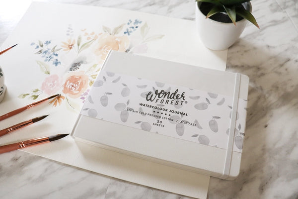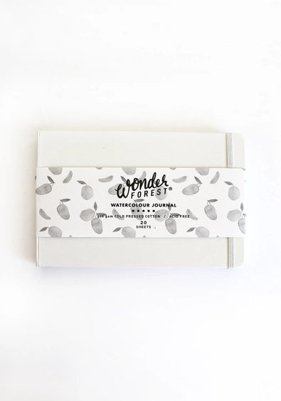 Our Professional Watercolour Journal comes with 20 sheets (40 pages) of thick 140lb (300gsm) cold pressed 100% cotton paper in a convenient 8 x 5.5 inch size. This paper has been upgraded from our previous cotton paper and is now more absorbent and even lovelier to work with! It’s a natural handmade style acid-free paper with a lovely texture. The journal features a hardcover white leatherette with elastic to hold shut and a lovely and simple gold embossed logo on the backside. It’s perfect for travel or creating a sketchbook full of your paintings.