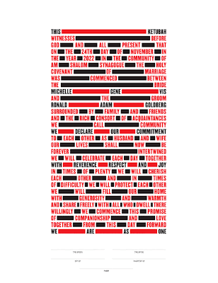 While Orthodox Jews use traditional content and wording there are many new, more artistic versions and interpretations of Ketubot that are being used. Many evoke the hopes and dreams of building a life together and many are beautifully created works of art. The examples above are beautifully traditional in visual design but the wording has been composed to welcome the marriage of an interfaith couple. Below, are visual interpretations that are more contemporary in nature and add a modern twist to a most timeless tradition. The final two incorporate striking graphics and font work- perfect for the minimalist in us all!